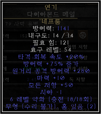 특히 위에서 언급한 모든 저항력 +50 옵션 때문에 지옥난이도에서까지 사용이 가능한 갑옷입니다.