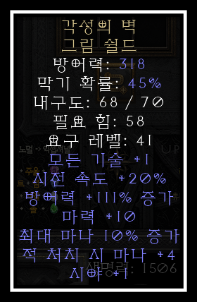 또한 41레벨 때 쓸 수 있는 유니크 방패인 각성의 벽 그림 쉴드와도 비교가 되곤 해요.