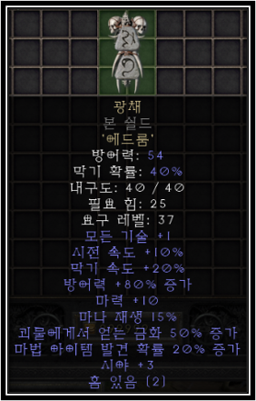 법사 계열 1티어 룬워드 방패인 영혼을 사용하기 전 대체용으로 쓰기도 하는 룬워드 방패인 '광채'입니다.